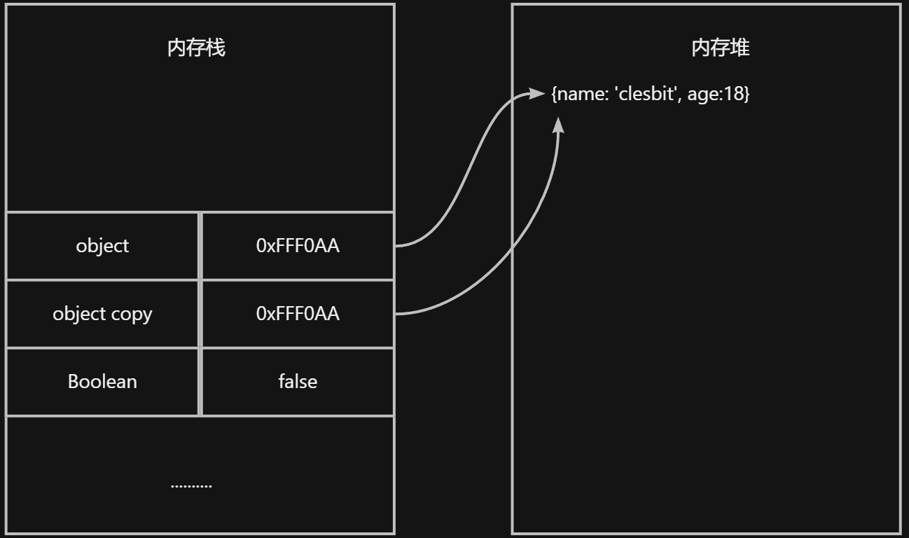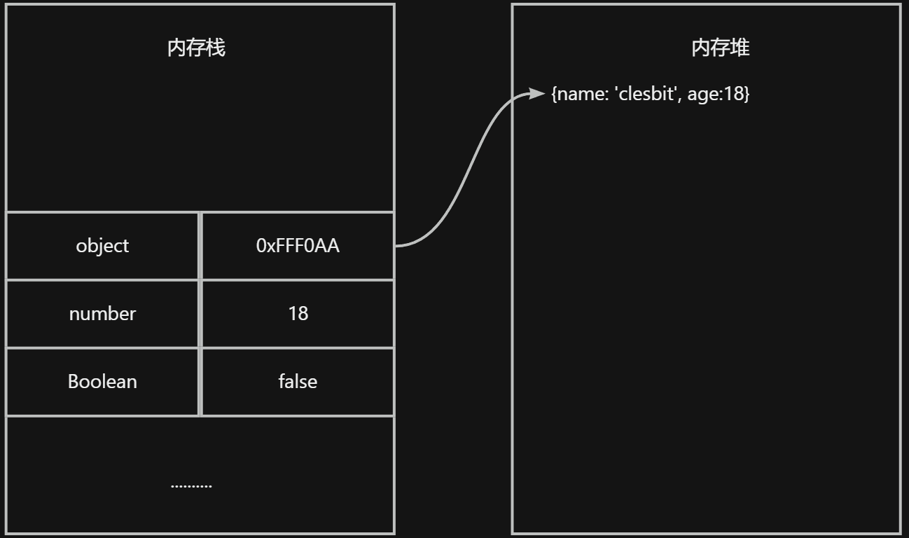 ,所以引用数据类型一般存储在内存堆当中,而声明的变量仅仅是指向这个实例的一个引用地址,这个声明的变量是存储在内存栈当中的。当访问一个引用数据类型的时候,会先到内存栈中寻找对应的引用地址,再根据这个引用地址找到内存堆中对应的实例。