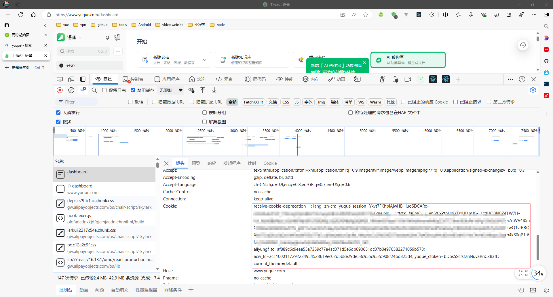 具体加入的方式是,浏览器会将符合条件的cookie,自动放置到请求头当中,例如,当我访问语雀的时候,它自动在请求头中附带了下面的cookie
